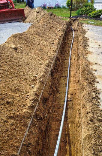 Professional trenching and electrical-grade conduit installation for underground mains, including proper backfill, warning tape, and compaction.